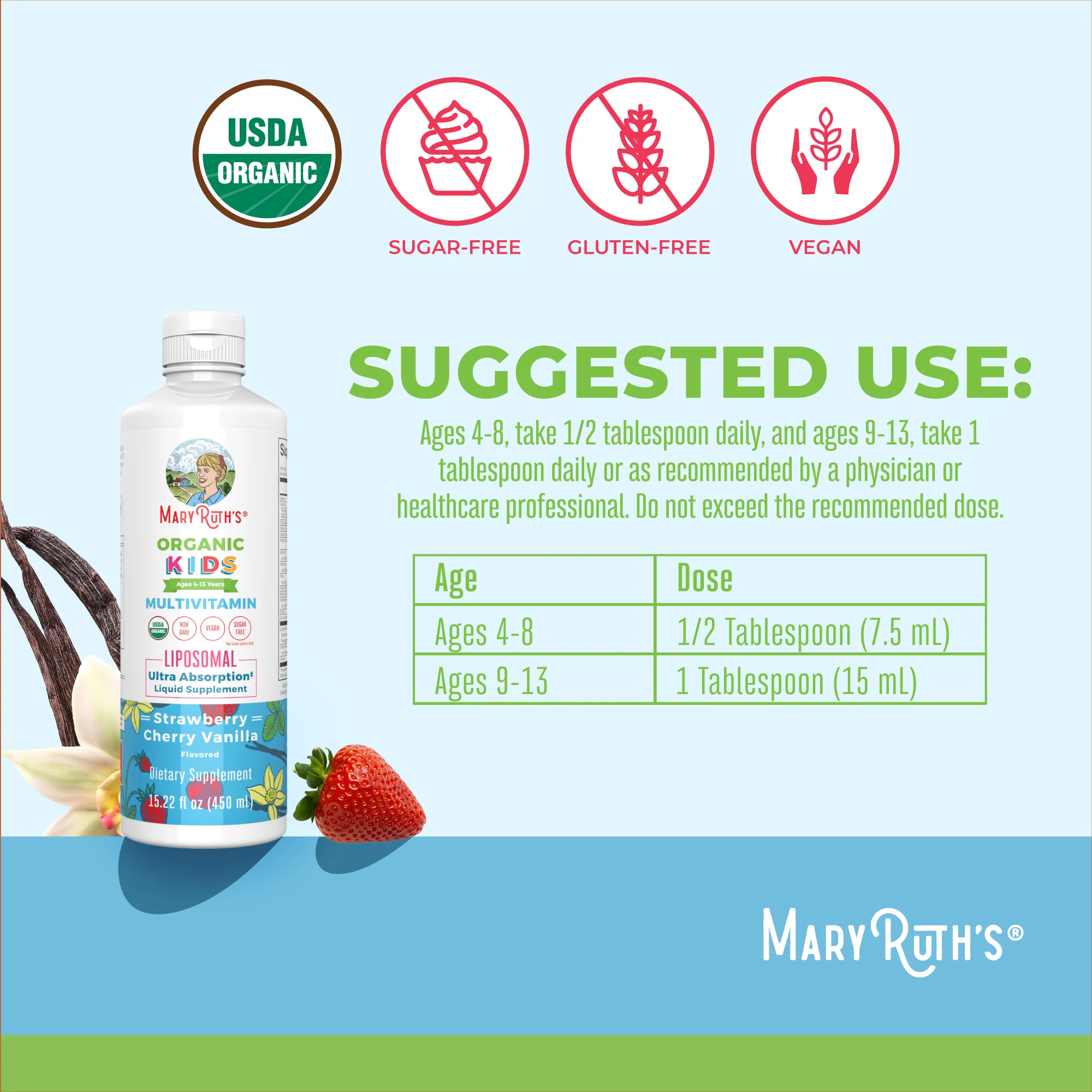Looking to support nutrient gaps in your child’s diet? Our Kids Organic Multivitamin Liposomal is an easy-to-take liquid in a delicious strawberry cherry vanilla flavor that kids will enjoy taking!Â