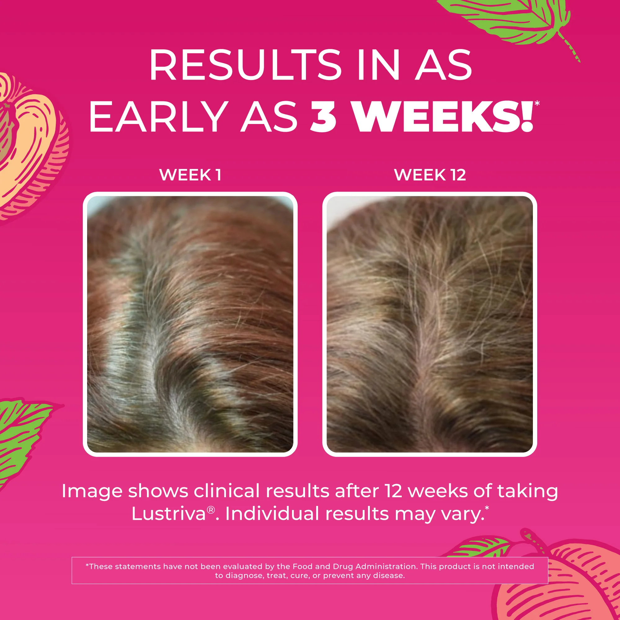 - Thicker, Fuller Hair: With Lustriva®, clinically shown in women to help support growth of existing hair to increase hair thickness in as early as 3 weeks.